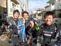 こんにちはJackです^^☆本日1発目は、いつも遊びに来てくれる沖縄に移住してきた千葉ちゃんの、元会社の同僚(?)さんたちが遊びに来てくれました^^(笑)シュンスケ君&コウヘイさん&セイジさんの3名です♪みなさん初めてでドキドキワクワクな感じで行ってきましたよ!!浅瀬ではユラユラ揺られながらも頑張ってすすんでいき、ニモと記念撮影☆ソフトコーラルを見つけて、ズーット触っていました(笑)餌付けの時も、みんな必死に魚を捕まえようと頑張っていましたね^^!!みんな、とっても上手でした♪感想頂いたので載せたいと思います!! シュンスケ君:洞窟は残念でしたが代わりに行った海、本当に最高でした。初ダイビングでした、でもスタッフの方が優しく教えて下さって危うく好きになるところでした。次回は洞窟いきたいので、よろしくお願いします。 コウヘイさん:見た事の無い世界でした。最高でした。今度はぜひ青の洞窟にチャレンジしたいです。次回も宜しくお願いします。 セイジさん:コンタクトレンズを外しても、しっかりとキレイに見えたので安心しました。ニモちゃんもカワイかったです。はじめは緊張しましたが、なれてきた後は終始楽しめました。酔わなくて良かったです。 |
