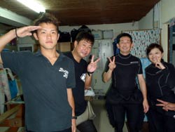 はいさ〜〜い、せーやです!!今日は連日いい天気が続いています♪少し白くなった体も今日でダイバーらしく黒くなりそうです。そんな中一緒に泳いでくれたのは、北海道からお越しの田村さん夫婦のたけしさんとまみさんのお2人とマエダ岬と砂辺でファンダイビングしてきました!!マエダ岬ではせっかくなので青の洞窟を目指して行きましたが、思ったよりも波があり行く前から緊張していた2人も海際に行くと緊張が増していましたね。でもゆっくり時間をとっていったのでしばらくすると全然問題なく潜っていけましたね♪水中は透明度もいいですが、魚の数がほんとに多くエサを持っていなくても魚達の方からドンドン寄ってきて2人も戯れていました^^この時期は青の洞窟も人が少なくゆっくりきれいな青も見れて二人もご満悦でした☆リュウキュウハタンポも群れてそれがシルエットになっていてとってもきれいでした!戻ってきて、お昼は浜屋でソバを♪ゆっくり休憩して砂辺のUFOポイントへ行きました!そこにはおっきいマットみたいのがありそこででんぐり返ししたりして遊んでUFOのとこへ。透明度が7Mぐらいであまり見えなくてUFOポイントに行くとサーモクラインがすごくて余計見れなくてまみさんがアタフタしてましたね^^でも今までで一番中性浮力がとれて2人とも充実した一本になったみたいです☆明日ジンベエ頑張ってください!!^^ |
