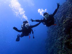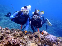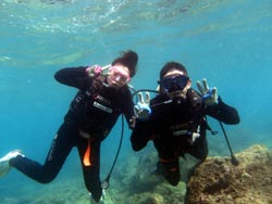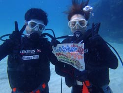 はいさい!本日2回目の体験ダイビングは特上スペシャル体験ダイビングCこーすだよ!担当のともだよ!遊びに来てくれたのは、昨日青の洞窟体験ダイビングに来てくれた、ぐんぼーとしばゆりちゃんです。二日続けてありがとうね〜〜!で楽しみました。まずは、自分で泳ぐ練習と呼吸の練習をしっかりして、昨日の復習とその後は、ビシバシ自分達で泳ぎました。空飛ぶ気分で浮き沈みをしながら、2人とも手を広げ本当に空飛んでるように泳いでいました。楽しかったね〜〜!ビデオや写真もいっぱい撮ったけど2人の写真を撮るときはぐんぼーにはかなり笑わされました。二人ともとってもとっても上手くてビックリです。是非是非ライセンス挑戦してみてください。とっても楽しい仲良しカップルでうらやましかったです。次はいつ沖縄に来れるか解らないだろうけど、待ってるからね〜〜!そんな2人のコメントは ぐんぼー:青い海ときれいな魚、サンゴが良くて見れて楽しかったです。沖縄ならではの、大自然は素晴らしいかったです。 しばゆりちゃん:固いサンゴと柔らかいサンゴを触れた感触が楽しめました。沖縄大好き!! |