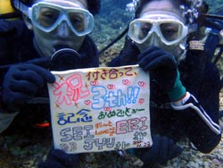 はいはーい!ども、りょーけんでっす。今日は体験ダイビングに行ってきました〜。今回一緒に潜ったのは富山からお越しのしょうちゃん&かなちゃん!新婚の2人とゴリチョで遊んできました〜。2人ともダイビング初挑戦で初めはかなり緊張していたようでしたが、ゆっくりと練習して慣らして行ったら水中はずっと笑顔でしたね(笑)水中ではクマノミを見て回ったり、魚に餌付けをしたり、ヒトデやナマコで遊んだりしてきました〜。最後は新婚のお祝いを水中でやったりもしましたね!今回2人からコメントをもらっているので掲載します。 |
