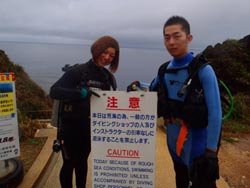 はいさい!!ひろあきです☆今日は朝から南風が吹いて暖かい一日になりましたよ〜^−^天気はちょっと残念でしが・・・。でも久しぶりに真栄田岬が開放されたので青の洞窟コースを開催してきました☆遊びに来てくれたのはRさんとSさんのお2人!説明もしっかり聞いてくれたのでかなりスムーズに水中世界へ入る事ができました♪今日の真栄田は透明度も抜群で魚の集まり具合も良かったです^−^洞窟の中も貸切状態で楽しめました☆今回はお2人が付き合って3年目という事でサプライズお祝いもしてきました☆喜んでもらえて良かったです☆★また沖縄に来る機会があれば是非遊びに来てくださいね♪ Rさん:大変お世話になりました。とっても丁寧な説明で初めてにも関わらず、楽しく潜れることが出来てよかったです。超キレイで感動しました。どうもありがとうございました。 Sさん:今日は本当にありがとうございました。初めて海に潜りましたが、、まさに別世界で感動しました。インストラクターの方も親切丁寧にそして楽しく説明してくれましたし実際潜ってからも調度イイペースでリードしてくれてありがとうございました。これからももっと潜って見たいと思います。また、キレイな海でお会いしましょう。したいです。!! |