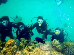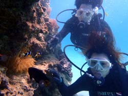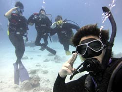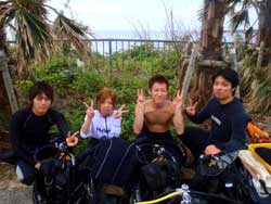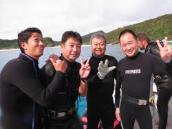 はいさ〜〜〜い、せーやです!!今日は風が北風が吹いているので、この時期多いゴリラチョップへ行ってきましたよ♪一緒に潜ってくれたのは、関西と言えば大阪!の元気な方4名と相棒ゆうき(Jack)と一緒に潜ってきました☆みんな初めてのダイビングで楽しみとちょっと不安をかかえて、いざ海へ!!説明をしっかり聞いていてくれてたので浅場での練習もスムーズでした☆水中ではズット笑顔の人もいましたね(笑)まずは、みんな大好きクマノミちゃん^^ばっちり記念撮影してから、泳いでる途中に見つけたナマコちゃん達!!みんな興味深々!!気持ち悪がる人もいたけど(笑)最後はたくさんの魚達にかこまれて餌付けもしてきました!!今日は青の洞窟に行けなくて残念だったけど楽しめたようでよかったです!次は洞窟行こうね♪みんなから感想いただきました〜載せます!! |