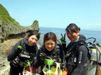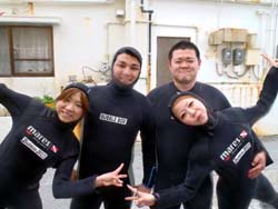 はいどうも、タクです。今日は関西からお越しの、ノリノリ看護師さん三人組が遊びにきてくれました(^^)あだ名はケイ姉、こまり、しんちゃんの三人です♪しんちゃんとこまりは、FUNダイビング。ケイ姉は初の体験ダイビング!!しんちゃんもこまりも久しぶりのダイビングだったから緊張してたね(笑)でも皆ぜんぜん上手だったから問題なかったよ♪写真もいっぱい撮ったからね☆FUNの2人は午後からはジンベイダイビングに行って、色々珍プレーしまくりましたが、ジンベイを堪能してきました(^^)ほんと次回はちゃんと足動かしてね(笑)青の洞窟リベンジとケラマ行こうね☆ では、体験担当のJACKにバトンタッチ!! どーもーJackです^^☆体験のケイちゃんを担当しましたぁ!!ケイちゃんは初のダイビングと言う事でしたが、ほぼ緊張なし!!(笑)説明中も「楽しみー」、水面練習では「楽しいー」、フィンを履かせてる時も「楽しいー」と…まだ潜ってないよぉー!!!!(爆笑)耳抜きに少し時間がかかるくらいで、それ以外は、まったく問題無し!!とってもスムーズに潜降できましたぁ^^☆水中ではズット笑顔の絶えないケイちゃんでした!!バランスも良いし、とっても上手でしたね♪サンゴに触れて「すごーーい!」、クマノミを見て「ニモーー!」、魚の群れを見て「わーー!」とバッチリ水中で声の通るケイちゃん(笑)横で私も大爆笑(笑)餌付けでは、エサをあげるって言うより、奪われてる感満載でした(笑)とっても楽しい時間でしたね♪感想頂いたので載せまーす! ケイちゃん☆初体験ダイビング。めちゃめちゃ楽しかったです☆青い海、サンゴ礁、キレイなお魚たち、ニモにも会えたー♪時間も忘れて魅せられました。ゆうきちゃんにも、しっかりフォローしてもらって水中遊泳満喫できました☆またダイビングしてみたいです♪ |