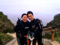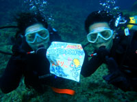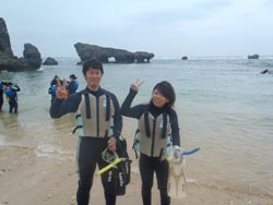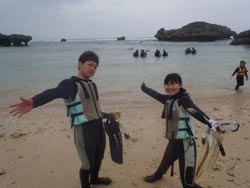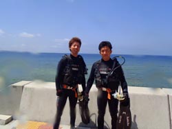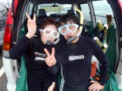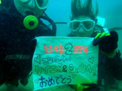 はいさ〜〜い、せーやです!!今日は海況と天気に恵まれた一日でダイビングするには、もってこいでしたね!!そんな中一緒にシュノーケルとダイビングのセットコースで遊びに来てくれたのは、新潟県からお越しの新婚さんよっしー&みっちゃん☆2人ともシュノーケルもダイビングも初めてでしたが、入る間際に少し緊張するだけで入ってしまえば海を思いっきり楽しめていましたね♪特にダイビングでは、バランスが難しく泳ぐにもコツが必要ですが少しづつなれていきダイビングの奥深さに気付きましたね^^そんな2人から感想もいただきました。 よっしー「すごいきれいでした。水の中から上を見たとき感動しました。サプライズでプレゼントもらって本当に嬉しかった。インストラクターの人が親切で楽しく過ごせました。セットでシュノーケルとダイビングをやれてよかった。写真を撮ってくれたのは、助かった!」 みっちゃん「本当に楽しく泳ぐ事ができました。最初はすごく不安でしたが、インストラクターの方の温かさに不安も楽しみに変わっていきました。海きれいでした!!雨も降らずさいこーでした。本当にありがとうございました^^」 |