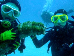 こんにちはJackです^^☆今日は、まだ落ち着かない砂辺と真栄田は使えないので崎本部のゴリラチョップに行ってきましたぁ!!遊びに来てくれたのは千葉からお越しの、まーぼー&はるぽんです♪2人とも初のダイビングで緊張気味でしたが、しっかり練習して海へ!!まーぼーが耳抜きに少し手こずりましたが2人とも無事に水中へ♪まずはキレイな砂地を、ゆったり泳いでクマノミちゃんのところへ^^☆途中ナマコと遊んだり写真もたくさん撮りました!!いやぁ〜「TAKE OUT OK」事件はマジでウケたねぇ〜(笑)まーぼーサイコー!!その時の、はるぽんの「え!?」って顔が忘れられないなぁ!次は絶対に青の洞窟行こうね!! まーぼー「初のスキューバー楽しかったです。家で海水魚を飼っているので一緒に海で泳ぐ夢が叶ってよかったです。今回青の洞窟にいけなかったので次は絶対に青の洞窟に行くぞーーー!!また来たい!また来たい!」 はるぽん「初めてのスキューバーダイビングとってもたのしかったです^^彼氏が(TAKE OUT OK)の意味が分からずたっくんが拾ってきてくれた貝を捨ててしまったのが、心残りでした、、、。今度沖縄に来た時は、ジャックにアワアワの一発芸教わりたーーい☆青の洞窟行ければ最高でしたが、満足しました^^☆」 |