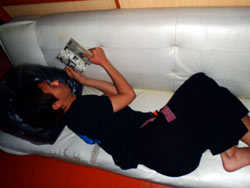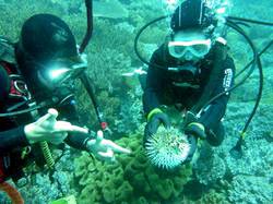 どうも!タクです。今日は慶良間へいってきました。去年遊びにきてくれた向谷さんことサーヤと、そのお友達のナナ!サーヤはライセンス持ちで、久し振りのダイビングで緊張してましたね〜(笑)ナナはうちなぁんちゅ!!初の体験ダイビングだし地元キターーーー!!!!笑)でもやっぱり初めてのダイビングだった〜〜!!!沖縄の人はあんまりしないからね(^^)慶良間へ向う途中はけっこう揺れてましたね。でも2人とも酔わなくて良かった☆まずは座間味島の湾内で、緊張ほぐすためにスノーケルから。ナナは泳ぐのはぜんぜん余裕だったけど、顔が小さすぎてマスクに水が入りまくってました(笑)お次のダイビングでは、マスクを交換していざトライ!!ちょっと下まで降りるのに時間かかったけど、ばっちり潜ることができました!とりあえずナマコとヒトデを拾いまくって、それ持って記念写真!ほとんどそんな写真!笑)マスクも水入らなかったので良かったです♪んで、三本目はサーヤとマンツーでFUNダイビング☆ポイントはトウマNO,1。エア持ちが良かったので、ケラマハナダイの根まで行ってきました!!チンアナゴもたくさん、ハダカハオコゼもいました。浅瀬に戻ってくると、タイミングよく日差しが差し込んできて、水中も光ってキレイでした〜〜(^^)上がってきたら晴れてて、なんで今なんだって思いながら、終わりましたとさ♪また次回、晴れたときにいってみようね!最後に、ナナからの感想です。 ナナ:初のダイビング♪最初はなかなかもぐれませんでしたが、なんとか潜れて楽しかったです!!次はもっと長くもぐりたいデス★ 紗耶:初ケラマでした!朝は雲ってて寒かったけど、午後には陽もでてきて楽しかったです。今度は日差しさんさんの中で潜ります!!曇っていても海水が透明でキレイでした♪ |