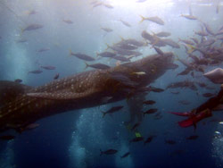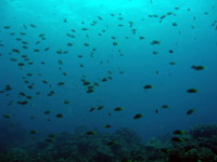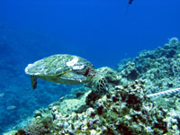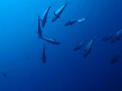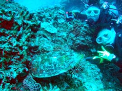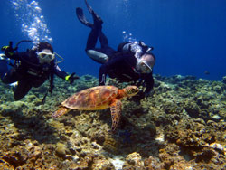 はいさい〜ひろあきです^−^今日はケラマへ行ってきました♪一緒に潜ってくれたのは昨日から引き続きのももちゃんとしゅうさんのお2人です。今日は朝から天気も良く気持ちのいい一日になりました!!まずはタマナーでカメ探しです!!潜って3分で即発見!!しかもサンゴをバリバリ食べている最中でたっぷりカメラサービスしてくれました☆二本目はアカヤーでのんびり泳いできました。サンゴポイントのアカヤーですが、サンゴが多いが故にオニヒトデもちらほら・・・・。もうすでに食べられて白くなっているサンゴもいて残念なことになっていました。。。でも浅瀬のサンゴは活き活きしててキレイでしたよ〜♪そしてラストは最近マンタがよく目撃されているという黒島へ!!夢と希望をもってアンカードリフトで潜ってきました。まずはいつものサメ穴を覗いてホワイトチップに挨拶☆あそこは居心地がいいんでしょ〜ね。もうずっといます。そして沖をみつつゆっくり流れに乗って水中探索してきました。プランクトンがたっくさんで雰囲気はばっちり!!グルクンも360度囲まれるくらいたっくさんいました。グルクンの群れ好きですね〜。ですが!!残念ながらマンタには出会えず・・・。やっぱりそう簡単には出てくれないんですね。。。帰りは潮風を浴びながらビールをぐびぐび飲んでるしゅうさんとももちゃんでした^−^またいつでものんびり遊びに来てくださいね♪ |