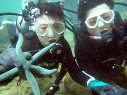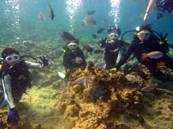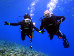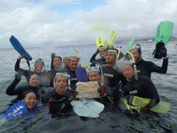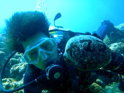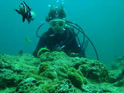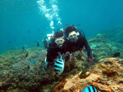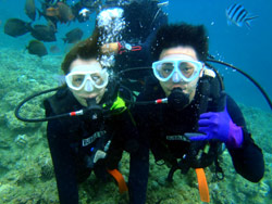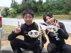 海おだやかで最高でした。今日の青の洞窟体験ダイビングは、ぶんちゃんとなっちゃんです。2人共最初から全然余裕で、練習している時にも魚を見て感動していました。透明度もよく最高でしたね。洞窟も青く光るように見えて、最高でした。とっても仲のいいカップルさんで餌付けでは魚を捕まえようと奮闘していましたが、さすがに魚もそう簡単には、捕まってくれませんでしたね。是非是非次回はライセンスゲットに挑戦してみてください。2人なら楽勝ですよ!!!そんな2人のコメントは< ぶんちゃん:海が青いって素晴らしい。沖縄に来たなって感じ。ライセンスを取りたくなる。 なっちゃん:青の洞窟がキレイだった!!ニモがかわいかった。沖縄の海はキレイだなー☆☆ |