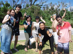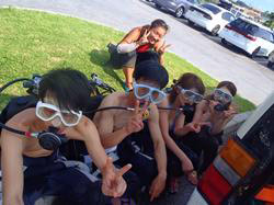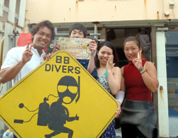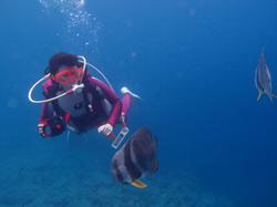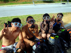 はいさ〜〜い、せーやです!!今日はまた夏らしい天気が戻ってきました♪なんと今日は台湾から観光で遊びに来てくれたハンさんファミリー4人組みです☆みんな初ダイビングで日本語を喋れるのが、息子さん1人だけです!!wなので通訳してもらいながら、陸で練習です。みんな個人個人喋ってなかなか進みません^^なんとか説明も終わって海に行くとみんな緊張しまくり♪なかなかうまく呼吸ができず戸惑いドキドキしてたね〜〜!少し浅瀬で泳ぐとみんなやっぱりこわかったのか途中でリタイヤしてしまいましたね〜〜。息子さんはスイスイ泳いでいて深いところまで一緒に泳いでクマノミをみたり一緒に写真を撮ったり、餌付けをしたりしました!代表で感想もいただきましたよ☆ ハンファミリー「非常に綺麗だった^^素敵だあーー」 |
