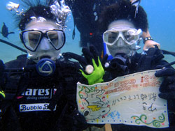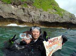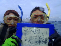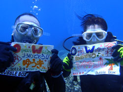 はいさい!!ひろあきです!!今日はめでたい一日になりました〜^−^今日は遊びに来てくれたのはライセンスをとって初めてのファンダイブのあっきーとゆっきーのお2人☆今回はいつもと違った重要なミッションがあったのです。。それは水中プロポーズ!!アッキーからユッキーに向けての一世一代の大イベント!!その大役を仰せつかったのですが(笑)まずは入念に打ち合わせ。コースや場所などを決めていざエントリー!!久し振りということでゆっきーがちょっとドキドキしていてこっちまでドキドキしていたのですが・・・(笑)なんとか潜ることが出来て最初はファンダイブ。そして後半いよいよ勝負の時が!!あらかじめ仕込んでおいたコメント入りハンカチをゆっきーがそっ〜と広げます。後ろでは「いいですか?」のボードを持ったアッキーが!!ユッキーは大きなオッケーサインをして応えてくれました^−^良かった〜^−^無事成功です!!!こっちまで暖かい気持ちになりましたよ〜!!そしてこの後は魚類最大の魚、ジンベイくんに会いに読谷村までひとっ走り♪初のボートダイブ・バックロールエントリーで緊張していた2人でしたが、じっくりとジンベイと一緒に泳いでサワサワすることができました^−^良かったね♪いつまでも幸せな2人でいてください!!!そしてまた沖縄に遊びに来てくださいね!!!いつでも待っていますよ☆今日はホントにおめでと〜〜☆☆☆☆そしてお2人からのコメントです。 アッキー:ひろあきさん、ゆうきさんサプライズご協力頂きましてありがとうございます。無事成功し、とても思い出に残る1日になりました。あと、ジンベイサメとも触れ合えることができ最高でした。また沖縄に行く機会があった時はぜひお願いします。 ゆっきー:まずは不安要素だらけの私のお世話終始ありがとうございました。無事今日の目標を達成できたのはヒロアキさん、ユウキサンのおかげです。丁寧で優しく接してくださり、感謝しますy。砂辺ビーチでのサプライズは正直びっくりを通り越してあの時はそれどころじゃなかったりもしましたが、とても思い出に残りました。ありがとうございます。ジンベエザメはこんな自分で大丈夫かとかなりビビっていましたが、近くで見れてサメ肌を体感してやっぱり行けてよかったです。素晴らしい、素敵な体験をさせて頂き本当に楽しませていただきました。 |