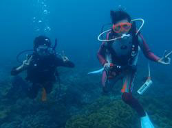 はいさい!今回は、サンゴのお花畑でダイビングです。参加してくれたのは、まーちゃんとりょうちゃんです。少しドキドキしていましたが、がっつりもぐりましたよ!耳抜きもコツをつかむと最後は、スイスイと自分達で泳げるようになりました。目標のニモに挨拶して、水中写真やムービーを撮ってリ、魚にエサをあげたり、ナマコやヒトデなど見つけて楽しいダイビングになりました。サンゴの上をフワフワと2人が泳いでいる姿は、ライセンスを持っている人に見えるほどでしたよ。次回もまた楽しみましょうね。二人のコメントは<