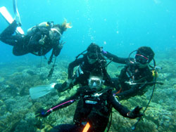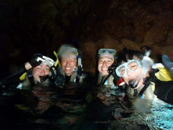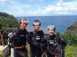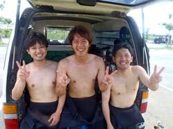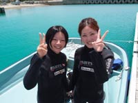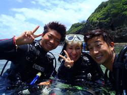 はいさ〜〜い、せーやです!!今日も最高の天気で人がもっといてもいい感じしましたが、今日は空いていてのんびり潜れましたね♪今日は宮崎県からお越しの高校時代の仲間3人が休みを合わせて遊びに来てくれました☆みんな初めてのダイビングで多少緊張した部分もありましたが、それぞれ徐々にコツを掴んで最後には1人でバンバン泳いでいましたよ〜〜^^今回は青の洞窟ダイビングだったので洞窟もバッチリ行ってきましたが、やっぱり人がいなくゆっくり洞窟の青も見る事ができました。みんなから感想も頂きましたよ〜〜♪ もりっこ「かなり楽しかったです!!耳抜きがなかなかうまくいかなかったんですが、魚を間近で見れて戯れることが出来てよかったです!次はライセンスを☆ 」チュニ「最初は緊張したけど、楽しくなってくると緊張も忘れて楽しめました!!」 ぶっちー「楽しかったです!!青い海青い空、青い魚最高です!!また来ます。」 |