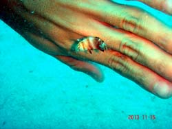 どうも、タクです。11月1日、今日はチンアナゴの日らしいです(笑)さて今日は、ビーチFUNダイビング担当です♪メンバーは、しばのさん、石垣行きを急遽キャンセルして参加のクボっちゃん、アンディーさんの3人です☆砂辺で三本、のんびりしてきました。天気も良かったのでお花畑が癒されました~。チーズケーキ付近でいろいろ生物探しをして、セミホウボウやオラウータンクラブ、ニモちゃん、カマスもぐるぐる回ってましたよ~~◎やんちゃなクボっちゃんはグローブ取っていろんなものをさわりまくってました(笑)巨大タコも発見!!!格闘しました(汗)墨だらけになってからの、皆で食べる浜屋ソバは格別でした(笑)やっぱ砂辺は面白いな~~、のんびりできるな~~~って、なんだか最近思う今日この頃でした。さて、今宵も飲みますよ☆☆ |