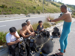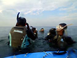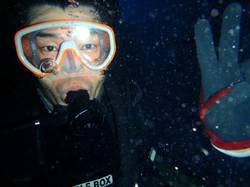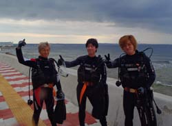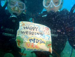 はいさい!本日少し寒いです。なのでゴリチョです。ゴリラがチョップをしている岩があるゴリチョです。メンバーは美人さん2名です。ゆたちゃんとみゆきちゃんです。寒いので、コンロ持参で、カップラーメン持参です。実験道具持参です。キュウリを水中に持って行き漬物ができるか??とペットボトルに浅漬けの元を入れて美味しく水中漬物ができるか?そして生卵を水中で割ったらどうなる??の3巻きです。まず、浅漬けの元ですが、うん!!うんうん!とっても美味しく出来ました。海に持って行った方がしっかりと中まで付け込むことがわかりました。かなり美味しく出来ました。そして生卵は・・・・なんだか不思議な感じです。宇宙船の中で卵を割った感じです。水圧でまん丸が保たれフワフワと黄身も割れず、宇宙空間です。魚は、おそるおそる食べに来ていました。そしてきゅうりですが、しっかりと海水がしみ込み漬物成功です。水中でも食べてみましたが、きゅうりでした。玉ねぎにはなりませんでしたが、これまた美味しくいただき、ご飯かビールに合いそうでしたよ!!そんな不思議なみゆきちゃんとゆたちゃんコンビで11月最後のビーチファンダイブだったとさ!!ゆたちゃん、みちゅきちゃんまた一緒に遊びに行こうね!! |