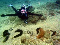 こんにちは、ゆうきです^^☆いやぁ~ついに寒くなってきましたよ!!沖縄…冬なんですね!?でも水中は、私的には、まだいける!!(笑)そんでもって本日のゲストは…なつこデラッ…いやいや、かわいいかわいいナッチャンです!!原田のナッチャンです♪マンツーで砂辺で潜ってきましたぁ!いきなり「生物はあんま興味ない」と言われたので、水中で遊び倒すことにしました(笑)1本目は、まず大量のカマスとグルクマの群れがお出迎えしえくれました♪いっぱいいたね!!その後とりあえず右ドロップ沿いをひたすらまっすぐ、ただただひたすら真っ直ぐ…コイボウミウシパラダイスだったね(笑)なっちゃんが至近距離すぎてフィンキックするたびに触れるナツコ…振り向くと真隣で私を笑顔で見つめるナツコ……(笑)お花畑の上をグル~~~っと泳いで戻ってきましたぁ^^2本目は題しまして「ダイエットダイビング作戦!!」とにかく泳ごう!ってことになってカリフォルニアからエントリーしてぐる~っと泳いで№1まで泳いできました!!あっっっっと言う間に着きました(笑)近すぎて2人で爆笑(笑)早々に着いちゃったのでコクテンフグを見つけて鬼ごっこ…ダイエットにならない2本目でした…3本目はナマコ大会決行です!と、2人で意気込んでエントリーです!!なっちゃんに、じゃぁ~「フィンつけてね~」と言うと水に顔をつけたのでフィンつけるのを待ってたら、いきなりフィンは腕にかかったままでプカ~ンと水面に浮くナツコ…そして手足をピチャピチャこまかく動かし始めるのでした…そんで顔をいきなり上げたかと思ったら「まちがえた!!フィンつけたつもりで泳いでた!」って(笑)一瞬の沈黙の後2人で大爆笑!!上から見たナッチャンのアホな格好が…いまだに脳裏にやきついたままです…夢に出て来ちゃう;;そして、とりあえず№1にいるナマコをグルグルまわって集めまくった結果…右の写真になりました…なつこデラッ…クス!?(爆笑)なんだか、とてつもなく泳ぎまくって笑いまくった1日でした。なっちゃん、お疲れ様!腹筋筋肉痛決定だね(笑)また来年ね♪では飲まれに行きましょうー!! |