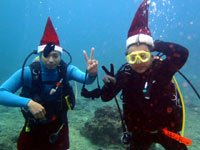 はいはーい!ども、りょーけんでっす。今日はFUNダイビングに行って来ました~!今回一緒に潜ってきたのは本日到着の箕輪先生!マンツーで砂辺の海へ行ってきました~。まず1本目は右下の砂地へ行ってのんびりとダイビング!ここ数ヶ月ずーっと同じ所に居るキリンミノを見たり、アカククリの幼魚を見てきました~。ラストにはカミソリウオをじっくりと見たりもしてきましたね!続いての2本目はクリスマスなのでサンタの衣装を着てのダイビング。とりあえずエントリーしてすぐに写真を撮ってからは左下の砂地へ行ってヤシャハゼとヒレナガネジリンボウを探してみましたが、今回は両方とも引っ込んでいて確認できず・・・。そのまま砂地をぐるーっと泳ぎ回ってみると小さいクマノミが大量についているイソギンチャクやさっき見たのとは別個体のカミソリウオを発見できましたね!帰り道でイソギンチャクの裏に家を作ってるモクズショイを見たりもしてきました~。今日はクリスマス!今晩はチキンを食べて宴会しましょうか~!! |