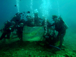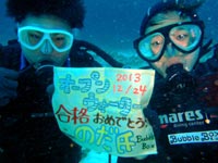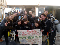 年越しナイトダイビング☆はいはーい!ども、りょーけんでっす。今日の夜は2013年最後&2014年最初のダイビングに行ってきました~!今回の年越しナイトに参加したのはスタッフも含め総勢26人!ナイト初体験の人も居れば、上級者の人も居たりと近年まれに見る大所帯でのエントリー。恒例のひろすぃが音頭を取る掛け声がいつもより大きく砂辺の海に響き渡りましたね!エントリーしてからは驚くほどスムーズに水中を移動開始。予定の場所ですぐに全員が集合完了できました!さすがに26人も居るとライトの光で夜の海でも明るかったですね(笑)カウントダウン前の時間を使ってわいちゃんの100本記念をしたり、ゴチャゴチャになる前に年明け用の集合写真を撮ったりしてました~。これだけやっても皆スムーズに動いていたので時間が余って、みんなの間にまだか?まだか?と言う空気が流れましたね(汗)ようやく迎えたカウントダウンでしたが、途中でブザーがうまく鳴らなくなるというアクシデントに見舞われましたが、何とか無事年越しの瞬間を迎えることが出来ました~!!水中で騒いだ後は水面に浮上してビール掛けでまた一騒ぎ。前回の教訓を生かして今回は全員ノンアルコールのビールを使いました(笑)その後はそのままナイトをするチームと戻るチームに分かれて行動となりましたね。さらば2013年!こんにちは2014年!今年も楽しいダイビングライフが送れますように!! |