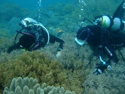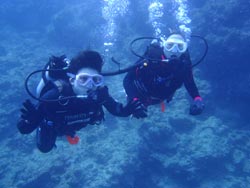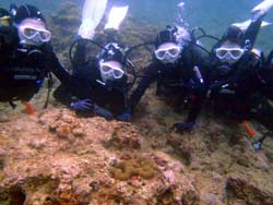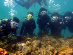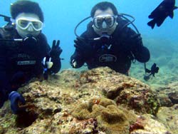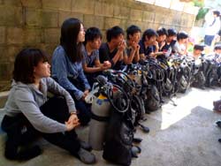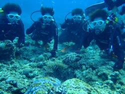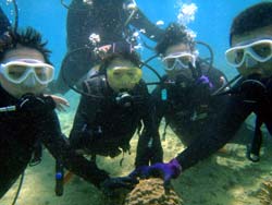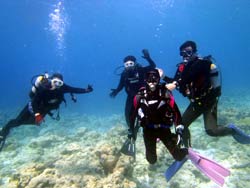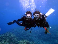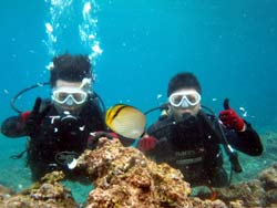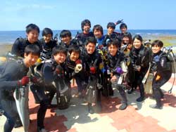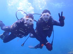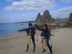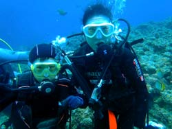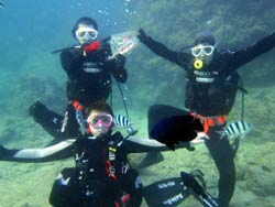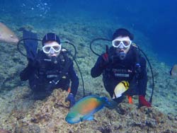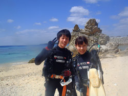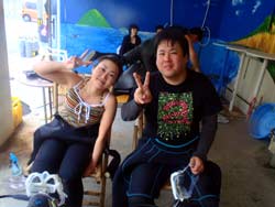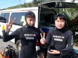 15時半 体験ダイビング 大沢 様 ユウタくん☆今日はありがとうございました。やっぱり水族館とは違うなーと思いました。またやりたいです。 お父さん☆海の中では自分の思った通りの動きが中々出来ず、テレビなどで見ているのとは違いました。サンゴや魚等なども色々な種類がいて、あまり人を怖がっている様子もなく、逆にエサがもらえるのがわかってるようで、面白いですね。今日は親切にサポートして頂き、ありがとうございました。沖縄のいい最後の想い出になりました。 |