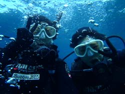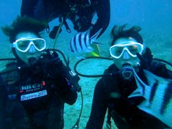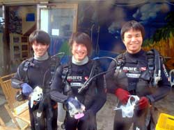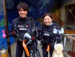 はい、どーもユウキです!!今日は以前BBでOWのライセンスを取りに来てくれた平田さんが遊びに来てくれましたぁ♪しかも、弟の祐太郎くんも体験ダイビングで一緒に遊びにきてくれました!!ガッツリ2本!!崎本部で潜ってきましたぁ!!祐太郎くんは初めてという事で緊張気味で、耳抜きに少しl苦戦していましたが、上手に潜れてましたね!!平田さんも久しぶりと言うことで緊張しまくりでしたが、ぜ~んぜん!!上手でしたよ^-^クマノミと写真撮ったり、追いかけっこしてるウミウシ見つけて観察したり、ハリセンボン追跡したり、魚にエサあげたりして2本とも楽しんできました!!また忘れないうちに遊びに来て下さいね^-^☆最後に祐太郎くんの感想載せます!! 祐太郎くん:耳抜きとか大変でしたけど、初めてのダイビング楽しめました。 |