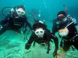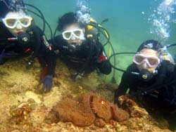 1時からの中野さん3人の女の子のコメントは 思っていたよりも海の中がとってもキレイで感動しました!!お魚も可愛かったです。たくちゃんしおんさんありがとう!まお 最初はドキドキしていたけど、たくさんのトーク術で緊張がほぐれました。ただ海中検索だけじゃなく、魚と触れ合えたりナマコを触ったり体験をいっぱい出来てとても楽しかったです。いくみ 初めてのダイビング問う事で初めはとても緊張しましたが、だんだんとリラックスできてとても楽しめました!!魚のえさやりをしたり、一発芸を見たり、最高の想い出になりました。たくちゃんしおんさんありがとうございました。なお |