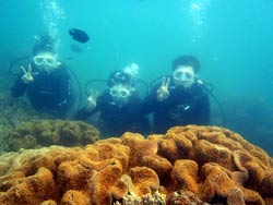 15:30 わたなべ様 体験ダイビング さおりさん:魚と一緒に泳いでいるみたいな気分でした。サンゴを触ったりエサをあげたりできたので、すごく楽しかったです!またトライしてみたいと思います! こうすけくん:けっこう深いところまで行けました。いろんな色の魚やサンゴを見れてよかった。また次回もダイビングしてみたいです。いい経験ができました。 |