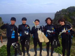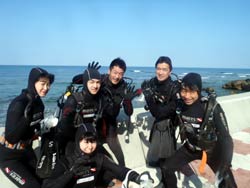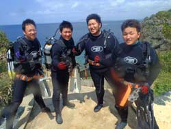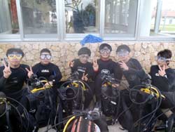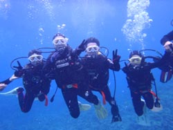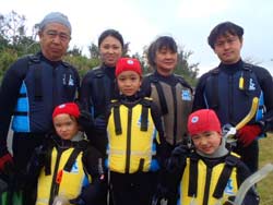 体験ダイビング 谷元さん 隆さん:沖縄サイコー!!ダイビングサイコー!!今日は、ありがとうございました。 翔悟くん:今日は初めてのダイビングでしたが、すごく楽しかったです。 魁士くん:魚がいっぱいいて、海もキレイですごく楽しかったです。今日はありがとうございました。 勝也さん:最初はドキドキ最後は、もう一回、沖縄来るぞーーー |