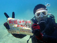 はいはーい!ども、りょーけんでっす。今日はFUNダイビングへ行ってきました~!今回一緒に潜ったのは本日誕生日を迎えた新保さん!マンツーでケラマへ行ってきました~。今回入ってきたのは神城(カミグスク)!久しぶりのポイントなのでワクワクしながらエントリーしてきました~。相変わらずメインの根周辺ではスズメダイ系がたくさん群れてキレイでしたね!これから幼魚シーズンで幼魚が増えるのが楽しみな感じでした。浅場へ移動してドロップ沿いを泳いでいるとくぐりぬけられそうなトンネルを発見し、突入してみると意外と長い・・・。だけど広さは十分だったので楽にくぐりぬけられましたね!船に上がる前に水中で誕生日祝いをやってから戻ってきました~。今年一年良い年を過ごしてくださいね~!! |