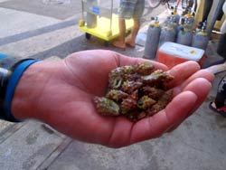どうも、タクです。今日はユタちゃんとマンツーで砂辺へ行ってきました。天気サイコーですが、海は少し不機嫌です(笑)揺られながらエントリーして、まず1本目はユタちゃんリクエストのモクズショイ探し!!夜行性のカニなので、まぁ薄々は思ってましたが、見事に空振り!笑)予定変更で、砂地にて生物探し☆穴から顔出してるカモハラギンポが、巣から出てまた入る瞬間を目撃!!!尻尾から入るんですよ~可愛いらしかったね~(^^)イエロージョーフィッシュもまだ居てくれました♪キョロキョロしててコイツも可愛いです☆他にもいろいろ見てたら60分も経ってました(笑)2本目はナマコ集めてタワーを作ろうってなり、そこら中のナマコを集めて集めて、いざタワー製作・・・。ものすっっっっっっごい地味になってしまったのでまた予定変更☆笑)またゆっくり生物探し♪してると、大きなタテヒダイボウミウシ発見!これはもちろんユタちゃんのMYハシでつまんでもらいました(笑)どうですか?隣の写真のドヤ顔ぶり(笑)その後もいろいろつまんでもらおうと探してると、オラウータンクラブ発見!しかし岩の裏へスルスルと・・あれ?どこ行った??って探してると、力みすぎてつかんでた岩が折れたりもして、しばらく2人で腹抱えて笑ってました(爆)帰りはお花畑を泳ぎながら息を整えて、無事エキジット。笑い死ぬところでした(笑)3本目は見たことないやつを見たいとのことだったので、がっつり休憩してハゼを見に行きました。ヤシャハゼとヒレナガネジリンボウを狙って、左下の砂地へ。じっくりみっちりキョロキョロ・・・うん、いない(笑)ってことで浅瀬へ。イバラカンザシをつまんでもらったり、ナマコにくっついてるヒダムシもつまんでもらいました。さすが隊長、上手です(笑)その後にヒダムシが、隣にいた魚に食われたことは秘密です(笑)いや~今日も笑った笑った。さ、飲むよ☆ |