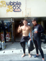 11時 サンゴコース体験ダイビング+スノーケル たかみちさん:バブルボックスは今回で3回目なのですが、いっつも楽しく遊ばせて頂いてます。今回は1人でスノーケルでしたが、すごく楽しめました。次回はダイビングに挑戦したいと思います。 綾さん:ダイビング4回目ですが、毎回毎回、最初はドキドキして潜れるかどうか不安になっていましたが、魚とサンゴが、とてもキレイで緊張がほぐれて楽しかったです。最後にトモさんがプレゼントを用意してくれていて感動!!サプライズありがとうございました。また沖縄に来た時はダイビングしに来ます。次は2人で…(笑) |