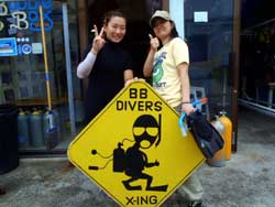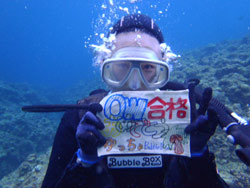 まいど~ひろあきです!!GWですね!!だんだんBBも賑やかになってきましたよ~!今日はオープン講習ラストの山ちゃんとトヨシーのお2人と、ファンダイブのまさくん&ヒラヒラ、そして午後からまさくんのお友達の初BBよしむぅーでワイワイ潜ってきました♪うねりもダイブ落ち着いて来た砂辺でエントリー。透明度はまずまず!今日はエントリーしてすぐに今まで見た中で最大級のコブシメが交接をするために同じ根でグルグル周っていました!メスに接近するためにオスも何匹か周りにいたのでかなり見応えがありましたよ~♪お花畑も太陽の光が差し込んでいたのでキラキラキレイでした☆講習最後には山ちゃんととよしーのラストスキルをみんなで見守り無事オープンウオーターダイバー合格です!!おめでと~~☆☆☆☆パフパフパフ~~☆☆これからも楽しい仲間と色んな海を見てくださいね。そして窒素を溜めたいまさくんとヒラヒラは4ダイブ目に突入~。深場に行ってジョーフィッシュやオトヒメエビなんかを見てきました。また明日も4本行っちゃう!?明日も楽しんで行きましょう!! 今回3日間の講習を終了した山ちゃんのコメントです!! 人生初のダイビングでオープンウオーター取得のコースを受けました。覚えるスキルがたくさんあって大変だったけど、優しく丁寧に教えてくれてダイブ本数が増える度に楽しくなっていきました。スタッフの方もインストラクターの方もファンダイブの方久も皆さん明るく元気で1人での参加だけどめちゃめちゃ楽しかったです。ありがとうございました☆次回もよろしくお願いします!!!!!by山ちゃん |