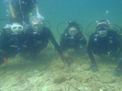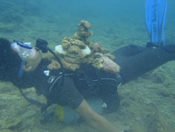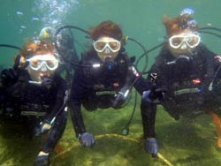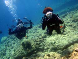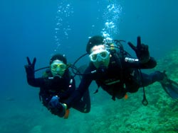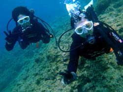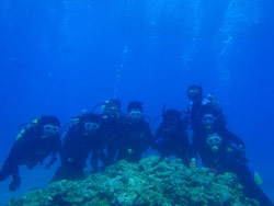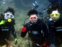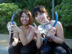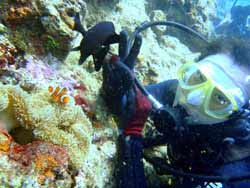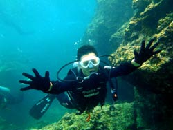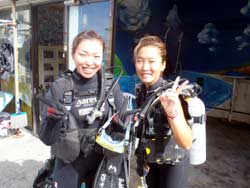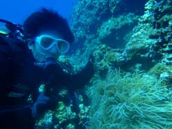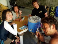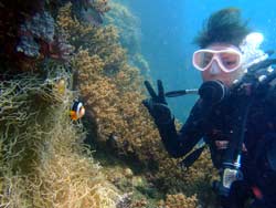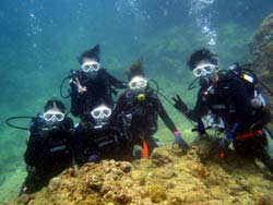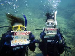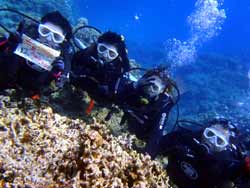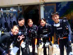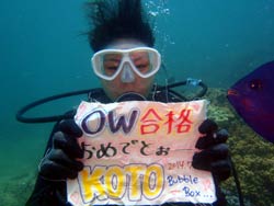 沖縄在住のことちゃんです。知り合いのおいっこさんですが、結構ばっちりダイバーにしあげれたと思いますよ!!!初日は緊張しているようでしたが、2日目3日目とますます上手くなり、フィンキックも上手になってきました。あとは中性浮力でピタリと止まれるようにカッコいいダイバー目指そうね!いとこのあきちゃんも夏には帰ってくるようだから、慶良間に行こうね。そうそうお友達の知念さんももうすぐ講習始まる見たいだしね!!仕事も遊びもがんばってね!松田さんにもよろしく言っといて~~!!!ことちゃん~~~ダイバー合格おめでとう~~~また潜りにおいでね!!待ってるよ~~!で台風気をつけてね。 |