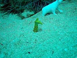 はいはーい!ども、りょーけんでっす。今日はFUNダイビングへ行ってきました~!今回一緒に入ったのは沖縄長期滞在中のゆたちゃん!マンツーで砂辺の海へ行ってきました~。久しぶりの上級者?FUNマンツーだったので1本目から右側の深場へ生物調査!お馴染みのジャパピグを見たあとさらに奥の方へ行ってゴンズイの群れで遊んだりしていると不意に大物の気配・・・。そーっと近づいてみるとなんとアオウミガメが登場!!慌ててゆたちゃんを呼び寄せたのでなんとか見ることができましたね(笑)お花畑の上を帰って来る途中でタイワンカマスの群れが横をすごい勢いで通過するシーンも見れました~。2本目は左側の砂地へ!しばらく見てなかったヤシャハゼやヒレナガネジリンボウを見て来ました。発見したはいいけどゆたちゃんが見つけられなかったのでスレートに絵を書いて見せたら大爆笑されてしまいました・・・(汗)それでも2種類見せることができてよかった~(笑)沖縄滞在がようやく半分くらいになったかな?また明日も楽しんでね~!! |