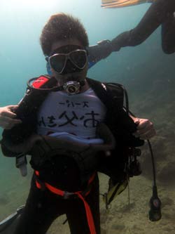 はいさーい!!なすびです★今日はOWラストのタカとFUNダイビングのにっしー・まりっぺ・かわちゃん・ひとしくんと潜ってきましたー!1本目・2本目はマエダ岬!!!まだ少し人が少ないうちに青の洞窟☆のはずが、タカの器材を忘れるというタイムロスのせいで既にそこそこ人のいる青の洞窟。。。><本当にすみません。。。青さは少し物足りなかったけどキレイでしたね!2本目はツバメの根!!かわちゃんが捕まえてくれたコクテンフグ可愛かったですねー^-^あの膨らんだ感じ、、、かわちゃんに似て、癒されるぅ~笑。OWラストのタカはこれで講習ラストダイブ!!!と言う事で、最後に抜き打ちテストをして見事OWに合格しましたー☆おめでとーーー^^時間ができたらいつでも遊びに来てね♪待てるよー!!!にっしーさんとまりっぺもまた遊びに来て下さいねー★そしてそして午後からは、かわちゃん・ひとしくんと砂辺で1本!!!なななんと!!!!このダイブでひとしくんは400本達成!!!!と言う事でともさんガイドでユウキも一緒に5人で潜ってきました^^せっかくの記念ダイブなので何かしよう!!ってことでしたがとくに何も浮かばず、、、笑。とりあえずちょっと遠出して遺跡と言われている「三段岩」!!ともさん以外は初三段岩と言うことで少しワクワク♪着いたら、、、笑。解らない、、、全然笑。でも確かに三段にはなってましたね^^戻りながらピグミーを確認して、タコと格闘!!!そしてそして最後はメインのひとしくん400本のお祝い!!ダイブマスター最後のスキルと言うことでともさんのデモンストレーションがはじまりましたー!!BC脱いで!!!スーツも脱いで!!!むむむ???!じゃーーん!!!「スーパーお父さん祝400本」のTシャツ!!脱いでひとしくんにプレゼントー☆ひとしくんにもその場でBCとスーツ脱いで着てもらいました!!!おめでとーー☆てかせっかく着たのに裏っかえし~(笑)「ーパースんさ父お」(笑)本当におめでとうございまーす!!最後はともさんとなすびがエア切れで変な繋がり方でオクト^^;いやー本当に面白かったな―♪かわちゃん!ひとしくん!!また一緒に潜れるの楽しみにしてまーす★ありがとうございました!!! |
