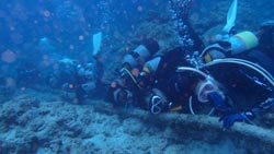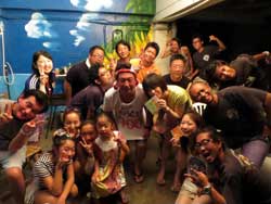 はいはーい!ども、りょーけんでっす。今日はOWラスト+FUNダイビングに行ってきました~!今回一緒に潜ったのは本日ラストを迎えたみーちゃん&きーちゃん、FUNダイバーやすねー、泉さん、わいちゃん、しんちゃん、岡ちゃん総勢7名!このメンバーでケラマへ行って気ましたー。朝は色々とドタバタスタートになりましたが、海況はバツグン!天気も良好!気持ちのいいダイビング日和になりました~。そんな中での1本目はカミグー!とりあえずカメ探しをしているとあっという間にタイマイ発見。食事中の大きな個体でしたね~。動く様子が無かったのでみんなで囲んで記念撮影!タマナーから流れてきたのかタマンの大群とも遭遇しましたね。続いての2本目はアカヤーへ行ってきました!サンゴに群れるキホシスズメダイたちを見たり、わいちゃんが発見したハナミノカサゴを見た後は船の下でOWラストの卒業試験!今回のお題はレギュレータリカバリー。初日はあんなに苦労したのに3日目となると楽々やってくれました~。そしてOW合格オメデト~!!!お昼休憩を挟んで3本目はジツルへ行ってきました~。いつもはドリフトをするポイントですが今日は流されずに戻ってきました!ドロップ沿いにオニテングハギの群れやバラフエダイの群れが薄っすらと見えたり(笑)途中でやすねーがだいぶ小さいモンジャウミウシを見つけてくれました!いつもは大きいモンジャウミウシが小さいと別種に思えてしょうがない・・・(汗)今日は帰ったらBBQ!食って、飲んで楽しみましょう~!! |