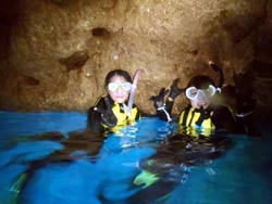 10時 青の洞窟体験ダイビング 岩崎様 だいちゃん:洞窟の中で小さな魚の群れは一見! はるちゃん:沢山のお魚さん達と一緒に泳げてとても楽しかった!! |
