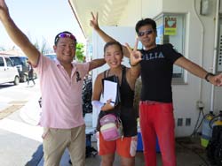 8時 体験ダイビング2本コース 吉田様 としきさん:やっぱり沖縄は海ですね! 今までの沖縄旅行で、一番楽しかったです!今度は来たときは違うポイントも挑戦してみたいです。またアドバンスのライセンスを取りにうかがいます。 ひろとさん:10年ぶり2回目のダイビングでしたが、前回よりも圧倒的に楽しく潜れました。また嫁と来たいです!!ありがとうございます!! ゆきこさん:初ダイビング!!感動しました。魚もいっぱいいて、海もキレイで、おてんきも良くて最高でした!!毎年、沖縄の海に来ます!ライセンスとろうかな…☆ |