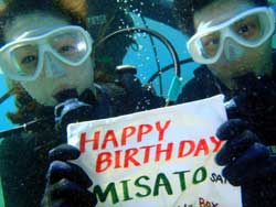 どうも、タクです。今日は砂辺でFUNダイビング担当です。メンバーは久しぶりのデカさん、マユさん、途中からはモッチーも参加して、4人で台風のウネリがすこし入りつつある砂辺へ行ってきました(汗)昨日からずっと透明度が良く、しかし少しだけ水温が下がってます。このことをアップウェアリングっていうんですよ(笑)1本目は左下のハゼ場へGO。ヤシャもヒレナガネジリンボウもいましたよ~。マユさんがハゼを真剣に撮ってる後ろで、デカさんが何やらモゾモゾとし始め、出てきたのはハッピーバースデイと書かれたタスキやらいろいろ出してきて突然お祝いしちゃいました(笑)俺も急に始まったもんだからあたふた(笑)わっちゃわちゃお祝いしちゃいました(^^)続く2本目でも、モッチーさんを交えてまずはジョーフィッシュを見て、イソコンペイトウも見て、さ~2本目もお祝いしちゃうぞってことで皆を集合させたわけですが・・・。まさかのマユさんが突然耳が抜けなくなり、恐らくイントラ人生初の、中層での誕生日祝いをしてきました(笑)いや~、フワッフワしましたよ(汗)でもバッチリ体に書いた素敵な文字をお披露目できたので、悔いは無いっす(笑)マユさん、おめでとうございます☆☆3本目は、デカさんとモッチーの2人で、ぶらりノープランダイビング♪一番良かったのは、開いた貝にウニをはさんで、プロポーズみたいに結婚指輪にしたことですかね(笑)さて、今夜は皆でバースデイお祝いしちゃいますよ(^^) |