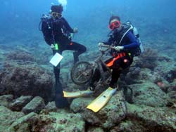 はいさーい!!なすびです☆今日は台風が迫る中砂辺!!!1本目は今日OWラストのらくちゃん&みっちーと、浮力調節の練習をしながら水中世界を楽しんできました♪2人とも今日は嫌いなスキルが無いのですごく楽しそうでしたね~^-^2本目は今日到着のデカさん&まゆさんも合流!!!これがOW講習ラストダイブということで2人で初心者マークをつけて潜ってきました笑。カクレクマノミやオラウータンクラブを見たり、サンゴのお花畑の上を泳いだり気持ちよかったですねー♪最後には水中でOWラスト恒例の抜き打ちテスト^o^みっちーがめちゃくちゃ苦戦したマスククリア!!!!2人ともかなり嫌そうな目をしていましたが、大分水中に慣れたのか余裕でクリア!!!2人とも無事ダイバーの仲間入りでーす!!!おめでとー☆★☆デカさん・マユさんも一緒にみんなでお祝いをしてきましたー!!2人ともこれからたくさん潜って、たくさん水中世界を楽しんでねーーー♪本当におめでとー!!3本目はデカさん・マユさん・ゆーきでUFOポイント!!!水面はうねっていましたが、水中は透明度バツグン!!!!かなり沖縄っぽかったぁ~笑。UFOに着くと、後ろに居たゆうきが嬉しそうに何かを発見っ!!指差す先にはチャリ!!!2人して大興奮で目がギラギラ☆o☆早速乗って全力でこいでみたり、二人乗りしてみたり、2人がかりで必死にUFOの上に運んでみたり完全二人の世界笑。マユさんも笑いながらたくさん写真撮ってくれてありがとうございます^^他にもウミウシを大量に集合させてみたり、クロハギの大行列があまりにもすごくて写真撮り逃してみたり、めっちゃ楽しかったですねー☆そしてそして今日はまだ終わりませんよ~!!砂辺に戻ってもう1本!ラストはマユさん・デカさんと生物探しの調査ダイブ!!!ん~。。。これといってとくに何も居なかったけど、ビビって土管を通れないデカさんが居ましたね~笑。今日はかなり砂辺を満喫しちゃいましたねー!!皆さん今日はありがとうございました!!! |