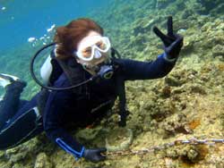 9時 サンゴ体験ダイビング 片岡様 さっちゃん:生まれて初めてダイビングをしました。ドキドキして色々教えてもらってましたが、とっても楽しく教えてもらって海へ^-^ウェットスーツ暑くてビックリ!!浅い所で練習。小さいお魚いっぱいで可愛い^-^ちょっと深い所になったらビックリして、ちょっと恐くなったけど優しく教えてもらえて安心。きれいなお魚いっぱいで初めてサンゴに触ったり大きいナマコ持ったり、エサあげたり、あっと言う間に時間が過ぎてしまいました。もっと遊びたかった。初めてで恐い事もあったけど、なすびさんのおかげでめちゃくちゃ楽しかったです。ありがとうございました!!またダイビングしたいです☆☆ |