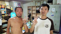 どうも、タクです。今日はビーチダイビング担当です。朝、メグさんを、クーラーの効かない高級車で空港まで送り、空港でワイちゃん&チエちゃんと合流☆三人で写真を撮り、そのままトモカもピックアップ。四人で湿気ムンムン車内でお店まで・・・。外は雨がざーざー降ってたので窓も開けれず、あち~あち~言いながら、途中でイヌイさんもピックしてバブル到着。砂辺の海況がまだ微妙だったので、皆で真栄田へ。ここはベタ凪。ゆっくり一本目へ。なんとこの一本目でイヌイさん100ダイブ達成!!!おめでとうございます(^^)これからも続けていってください!!!!そして以前、チエちゃんと一緒に見たナポレオンがいるところへフラ~~っと行きました(笑)ま~いなかったですけどね!!!!(笑)その代わりに?テングカワハギちゃん発見!!!さらにはイロブダイの幼魚ちゃんも!!!キビナゴもかなり群れてました~~♪・・・結構ネタを出し尽くしてしまった真栄田、砂辺の海況を聞くと、だいぶ落ちついたとのことだったので、戻って砂辺へ(笑)イヌイさんは一本で終了だったので、トモカ、チエちゃん、ワイちゃんと砂辺へ。心配だった透明度は思った以上にキレイで抜けてました!!16・・いやいや13Mくらいです(笑)ね?ともか!!deepでジャパピグを探して、あれ?いない・・って思いながら焦る俺、そしたらチエちゃんが「これこれ!!」と指さす先にジャパピグさん!!!!ナイスプレー!!!(笑)ジョーフィッシュは全然顔を出してくれないヤツだったので、即撤収!!!(笑)ドロップ沿いでカニやらウミウシを探して、お花畑でのほほんしてきました☆★三本目は・・・かなりエアーが減るダイビングになりました(笑)長いパイプ棒を見つけて、それで逆上がりしたり、リンボーダンスしたり、棒の先から口で吹いたり鼻から吹いたり・・・。ワサワサしてたら、指から出血(笑)ふと気付くと沈船が落ちてたり?!?!悪さをしたら、もちろんイエローカード!!トモカが二枚目出されそうになったら、水中に長谷部が!?来てレフリーを説得(笑)などなど。とにかく笑った三本目でした。ありがとうございました(笑) |