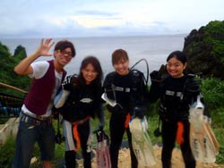 はいはーい!ども、りょーけんでっす。今日はOWラスト+FUNダイビングに行ってきました~!今回一緒に潜ったのは本日ラストを迎えたしゅう、ゆう、あかねちゃんとFUNダイビングチームおまつさん、広瀬くん、横山さん、乾さん!計7名でのダイビングになりました~。今回はOW3人から感想をもらっているので掲載させてもらいます!! あかねちゃん:初めてのダイビングで、まずそこからご迷惑をお掛けしました。ごめんなさい。でも、そんな私にひとつずつ丁寧に教えて下さったりょーけんさんとジョイさん。水の中で呼吸することがあんなに怖いものに感じるなんて思ってもいませんでした。また、マスククリアも苦手中の苦手でなかなかできず・・・。でも最後にはなんとなーく出来るようになって嬉しかったです!!3日間優しく丁寧に教えてくださり本当にありがとうございました!!問題児ですみませんでした!!感謝!!沖縄の海サイコー!!BBサイコー!! |