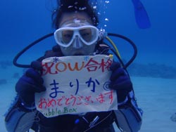 8時 Wコース松井さん ・楽しかった。サイコーでした。初めてのダイビング、親切・丁寧に教えてもらえたので、すぐに楽しめました。セイちゃんかっこいい☆また沖縄に来る時はバブルボックスで潜りたいです!!!!ありがとうございました^-^ |