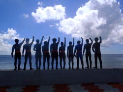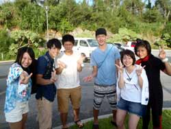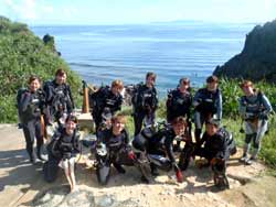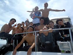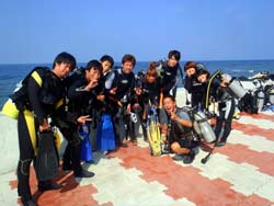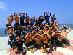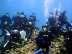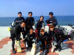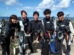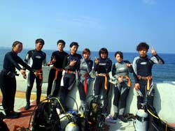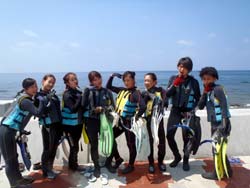 FLAT(Aチーム)ビーチFUN 10名ワイワイちーむです。今日はとっても天気で最高のビーチダイブ日和ですよ~~!メンバーがこんな奴らです。右の写真⇒!!さてさて皆で 仲間の意識を高めてから右の写真⇒!!行ってきま~~す。さてさて恒例のお花畑は気持ち良くてとってもキレイでした。初心者も居るのでのんびりと中性浮力や泳ぎ方などなど練習をしながら1本目です。そしてドロップを眺めながらの2本目では、甲殻類やガラスハゼなどなど少し小物さがしです。なんだか少しづつですが上手くなってきています。耳抜きを心配していた人もいましたがバッチリ大丈夫でしたね~~!3本目は全員で撮影大会です。ニモと写真をとったり好きな人と水中で写真をとったりマスクを外してサングラスをかけて写真を撮ったりと少し高度な事にも挑戦した初心者もいましたね!明後日はケラマでファンダイブですよ!がっつり楽しみましょう~今日も3ビーチダイブ楽しみました。 |