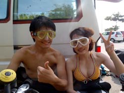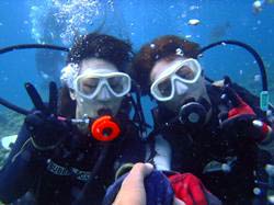 8時~ 体験ダイビング 中村さん 中村:初めてのダイビングを体験させてもらいました。海の中はきれいでとても感動しました。丁寧に指導して下さりありがとうございました! 中林:ダイビング初挑戦でした。TAKUちゃんが楽しく引っぱってくれて、不安無く楽しめました。またダイビングしたいです。TAKUちゃんありがとう。 |