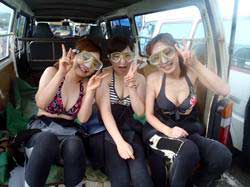 8時 サンゴ体験ダイビング 西村様 直子さん:魚がとってもキレイでした!!耳抜き上手くできなくてニモを間近で見る事ができなくて残念です。 ミキさん:初めてのダイビングでしたけどすごく楽しかったです!!生き物が苦手だけどかわいい魚たちに癒されました!またやりたいです。 ゆかりさん:最初は息がうまくできなくて、潜れないかと思ったけど、ニモのところまで行けてよかった。ニモのブリーフかわいい!! |