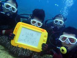 8時 サンゴ体験ダイビング わたなべ様 しーちゃん:とても楽しかったです。ニモが可愛かったです。緊張してたけど、声をかけて下さってリラックスできました。一発芸すごかったです!!ありがとうございました。 いっしー:楽しかったです。疲れました。 |