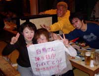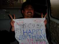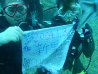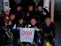 どうも明けましておめでとうございます!!!元旦に金髪になった健太郎です!!さぁ今日はゆっくりお昼からゴリチョに行ってきましたよ!ゲストは山本さんとジャーミー君を店に残して、ひろみちゃん、洋君、天野さんです!今日は天気もよく透明度も沖に出ればまずまずでした!!ゆっくり2DIVEした後は1日遅れの年越しちゃったよナイトです!ナイトには山本さんも加わりにぎやかになりました!中でも丘担当のスタッフのムネさんは「2004年初DIVEなのにラストDIVE!」などと言ってました(笑)そんなわけで総勢8人でにぎやかなダイビングでした!冬の寒さもそれほど感じず上がってからも全然大丈夫でした!来年は年越しダイブもしたいと思うのでみなさんまた遊びに来て下さいね!!!!!!!!!!!!賀正!!!!!!!!!!! |