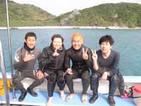 たかっちゃん!久しぶり?2年ぶり?元気でしたか?この姿を見れば元気だったようですね。だもんで(名古屋風に)今日はニモに会いに行きました。少し波があったけど その波に乗り流れに実をまかせ ルパン?のように ダイビングを楽しみました。なんか わかんないけど メチャメチャ楽しかったね。いつも苦手な耳抜きも今日は かなりスムーズに 魚もいっぽい見ました。少し肌寒かったけど 遅いお昼を 鍋して あったまり 楽しい1日でした。 |