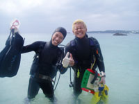 さぁ今日は今回の連休で沖縄に遊びに来てくれた池田君と彼女のまきちゃんの体験ダイビングです!!!とても元気の良い仲良しカップルの2人はビデオカメラをもってやってきました!!もうかなり海になれているようでものすごく飲み込みが早く、早く潜らせてくれと言わんばかりの勢い!!海の中でも泳ぎまくってました(笑)必死に魚を追いまわしている姿はかなり笑えましたよ!!!ぜひ次はライセンスを取ってみてください!!もっと海が楽しくなりますよ!また沖縄に来た時には遊びに来て下さいね!!!!!!! |