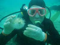 今日はスクール卒業の浅野さんとファンダイビングの加瀬さんです。昨日よりは透明度が良く綺麗でしたね。浅野さんは自分で浮力調整をし、昨日よりも魚を見ましたね。モンツキアカヒメジ、コブシメ、ハナミノカサゴ、へコアユ、シラヒゲウニを見ました。シラヒゲウニを手の平にくっつけて遊びましたが、なかなか浅野さんにはくっつかなかったですね!浅くなるとエアーを抜くタイミングが少し遅い時があるので早めに抜きやすい体勢でエアーを抜きましょうね!加瀬さんはこのポイントを絶賛していました。浅野さん、卒業おめでとう!!友達の伊藤さんと一緒に潜りにいけるね!また遊びに来てくださいネ! |